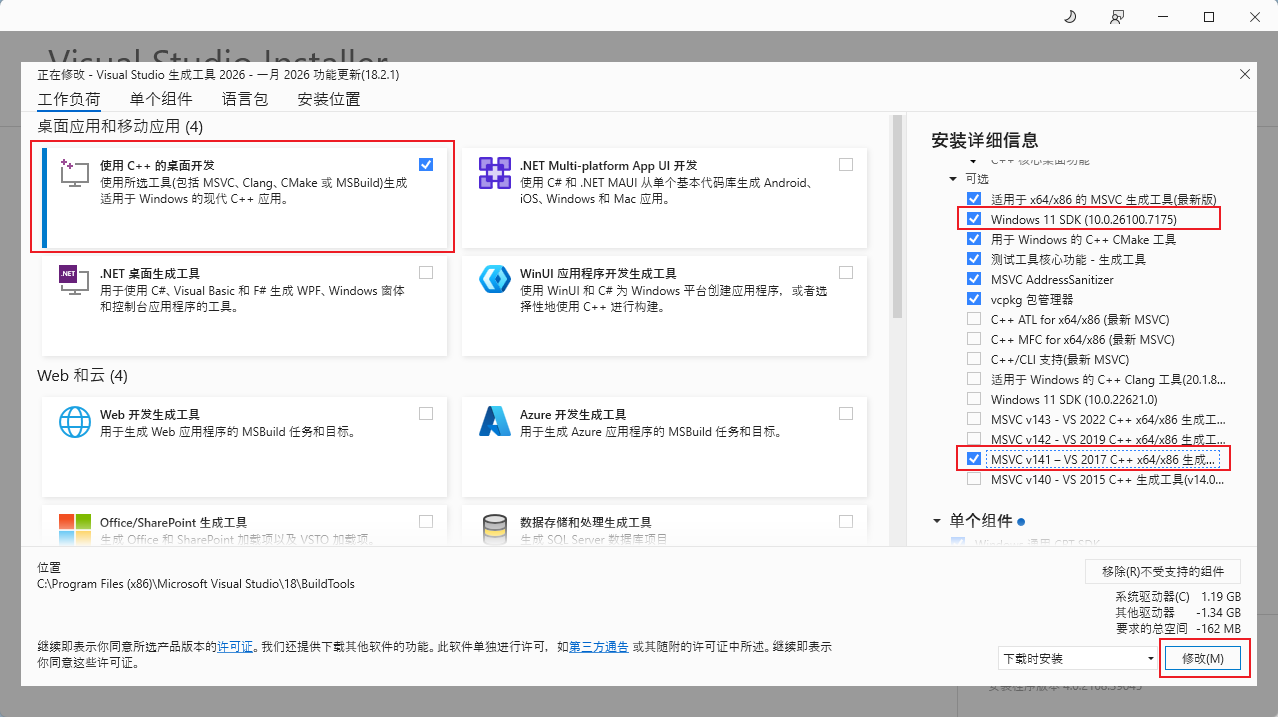Visual Studio Build Tools 工具,可选择性安装指定组件,避免完整安装导致占用更多存储空间。这里主要安装 MSVC编译器Windows SDK