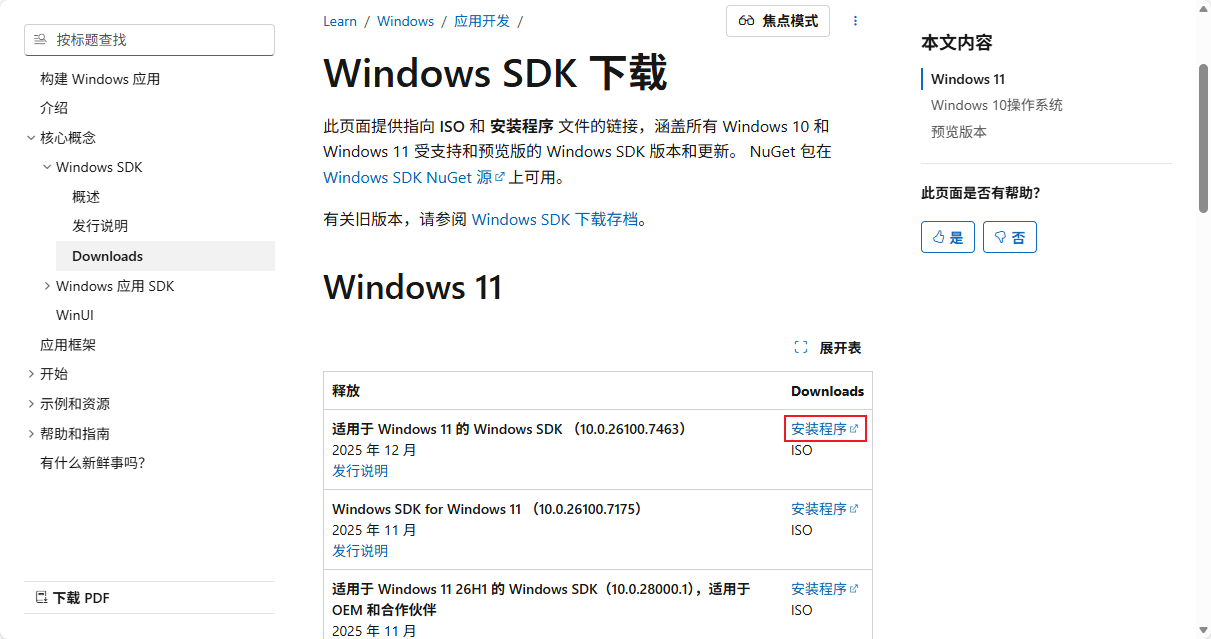 1. 打开网页下载 winsdksetup.exe,下载匹配系统版本的 Windows SDK 安装程序 winsdksetup.exe,笔者为 Windows 11,因而下载适用于 Windows 11 的 Windows SDK
