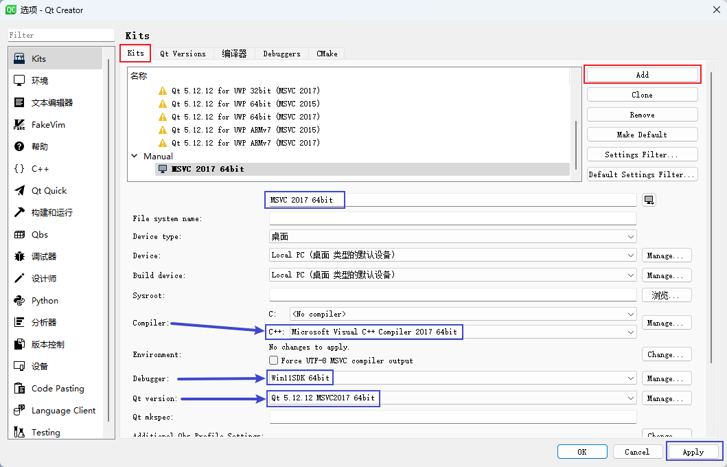 1. 在 Qt Creator 中,依次选择:工具–>选项–>Kits–>Kits,点击 Add。进一步地: