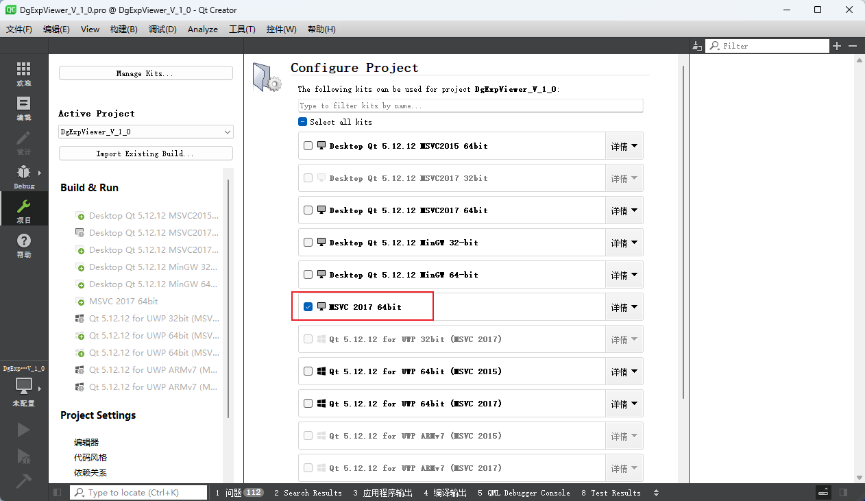 1. 至此,完成了编译器的配置,当新建或打开一个项目的时候,可以选择这个 Kit,即 MSVC 2017 64bit
